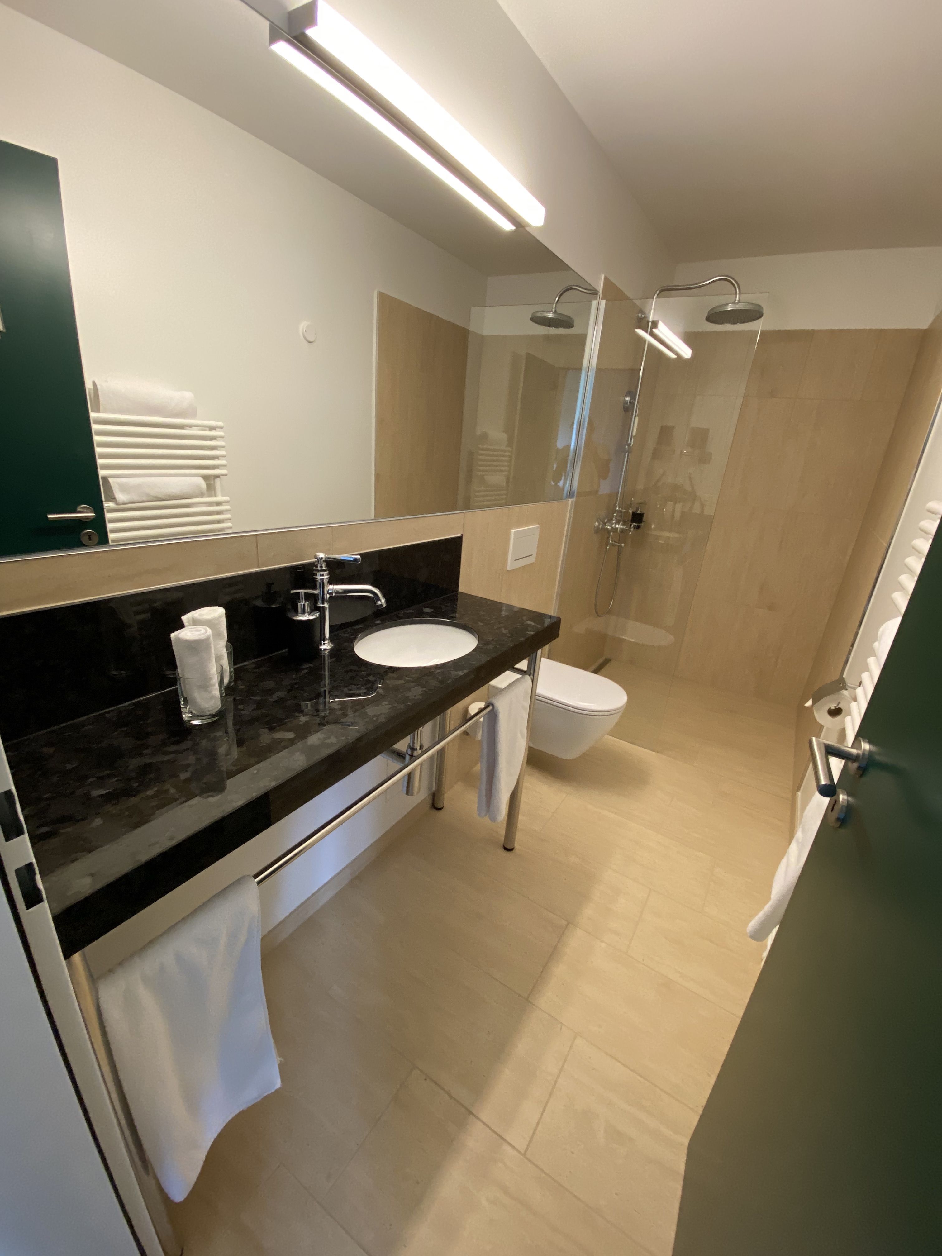 - Badezimmer mit Dusche, WC, Kosmetikspiegel, Föhn