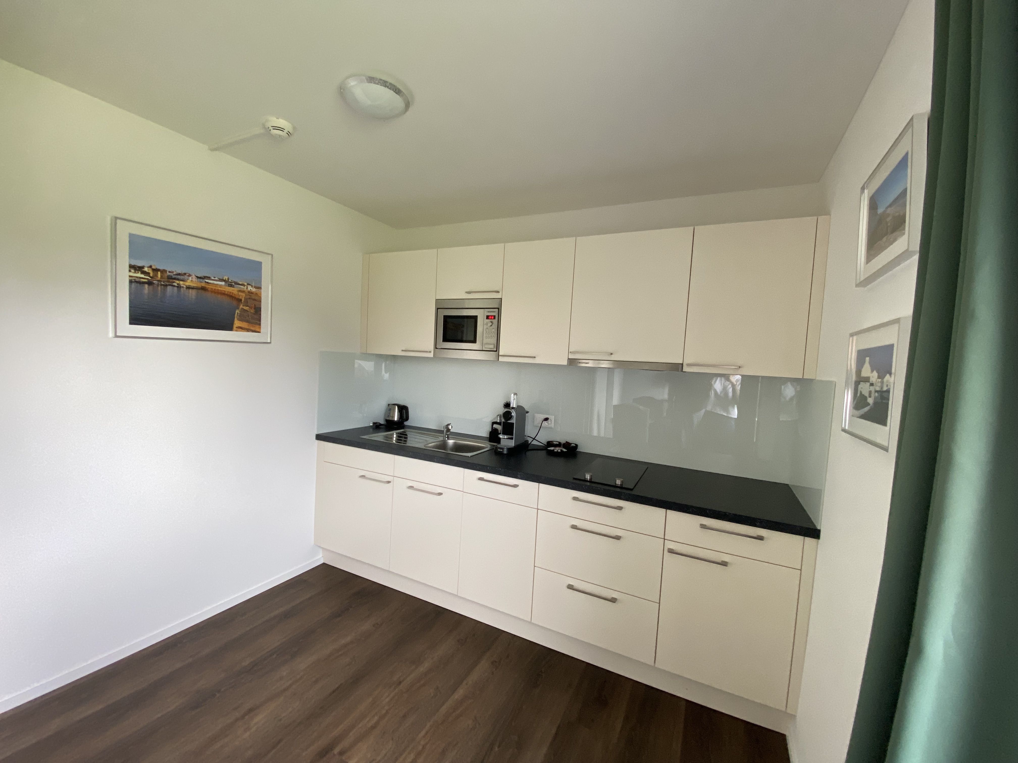 - Voll ausgestattete Wohnküche mit Nespresso-Kaffeemaschine, Spülmaschine, Kochfeld und Mikrowelle