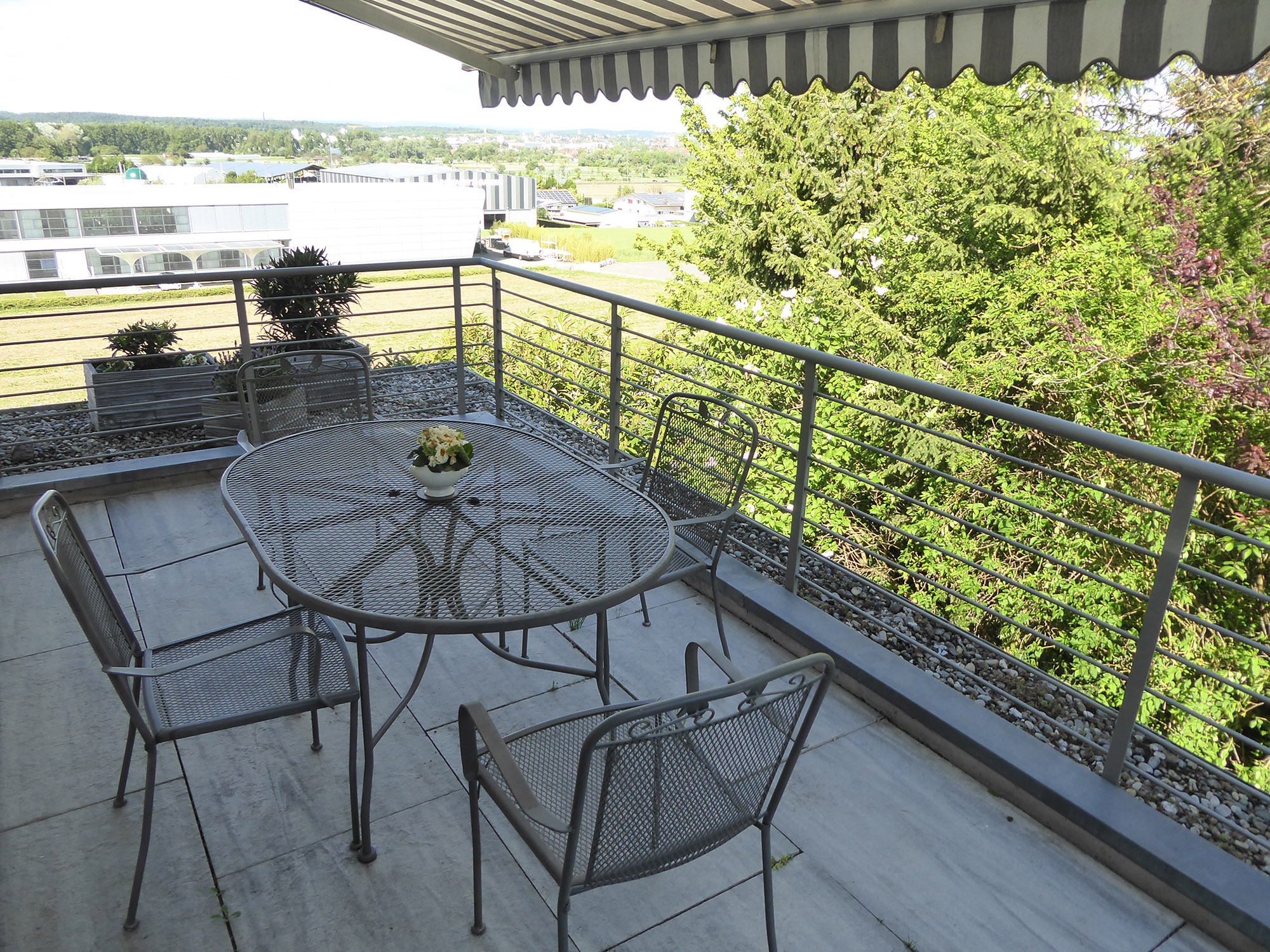 Unsere Ferienwohnungen „Rheinblick Rheinblick“ liegen im charmanten Tägerwilen am Bodensee. Die hellen, exklusiv und modern eingerichteten Nichtraucher-Ferienwohnungen haben eine Wohnfläche von ca. 90qm2 und liegen ruhig in einem Villen Viertel. Mit einer Wohnküche, zwei Schlafzimmern, komfortablem Bad mit Dusche und Badewanne, sowie einer separaten Gäste-Toilette sind die Ferienwohnungen wohnlich geschnitten. In der Einbauküche ist ein Umluftherd, Ceran Kochfeld, Kühlschrank, Mikrowelle, Kaffeemaschine, Wasserkocher, sowie alle wichtigen Küchenutensilien vorhanden. Der Wohnbereich mit einem Essplatz für 4 Personen, Schlafsofa und Sat.-TV führt zur Terrasse mit Gartenlounge. Die beiden Schlafzimmer sind mit einem Doppelbett und Kleiderschrank gemütlich eingerichtet.